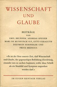 Brunner, Emil u. a.: Wissenschaft und Glaube. Erlenbach-Zürich: Rentsch 1944. 8°. 134 S., engl. broschiert (Einband mit leichten Gebrauchsspuren; altersgemäss gut erhalten) (=Schriften der Mlle Marie Gretler-Stiftung Zürich, 1)
