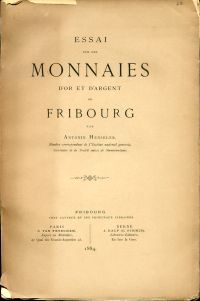 Henseler, Antonin: Essai sur les monnaies d’or et d’argent de Fribourg. Paris: C. van Peteghem; Bern: J. Dalp 1884. Gr.-8°. 5 Bll., 135 S., 7 Tafeln, broschiert (Seiten teilweise nicht beschnitten Papier altersbedingt leicht gebräunt; Umschlag und Rücken mit Randläsuren und Fehlstellen; sonst altersgemäss gut erhalten)