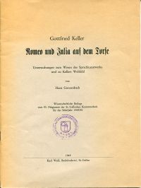 Gonzenbach, Hans: Gottfried Keller: Romeo und Julia auf dem Dorfe. Untersuchungen zum Wesen der Sprachkunstwerks und zu Kellers Weltbild. St. Gallen: St. Gallische Kantonschule 1949. 4°. 47 S. geheftet (gebräunt; Stempel auf Titelblatt; Bibliotheksexemplar; Ecken wenig bestossen) (=St. Gallische Kantonsschule, 93. Programm 1949/50, Wissenschaftliche Beilage)