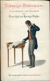 Korrodi, Eduard (Hrsg.): Schweizer Biedermeier. Ausgewählte Geschichten von David Hess und Rodolphe Töpffer. Zürich: Fretz und Wasmuth 1936. 8°. 344 S. 63 Abbildungen nach Originalen von David Hess und Rodolphe Töpffer, Salomon Landolt u.a. Leinen (Schutzumschlag mit leichten Randläsuren und angebräunt; gut erhalten) Gottfried Keller nannte David Hess einen geistreichen Dilettanten, Hess bezeichnete sich selber als tätigen Müssiggänger. – Rodolphe Töpffer war ein Schweizer Zeichner und Novellist. Er ist vor allem für seine Bildergeschichten bekannt, die als Vorreiter der Comic-Bücher gelten.