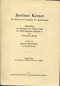 Büttiker, Heinz: Justinus Kerner. Ein Beitrag zur Geschichte der Spätromantik. Zürich: Emil Rüegg 1952. 8°. 227 S. broschiert (gut erhalten)