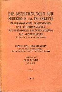 Benoit, Paul: Die Bezeichnungen für Feuerbock und Feuerkette im Französischen, Italienischen und Rätoromanischen. Mit Besonderer Berücksichtigung des Alpengebietes. Halle (Saale): Karras, Kröber & Nietschmann 1925. 8°. 81 S., 1 Tafel mit 16 Einzeldarstellungen; Kartenbeilage, broschiert (Widmung des Verfassers auf Titelblatt; Einband wenig abgegriffen; sonst gut erhalten)