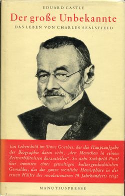 Castle, Eduard: Der grosse Unbekannte. Das Leben von Charles Sealsfield (Karl Postl). Wien/München: Manutiuspresse 1952. 8°. 726 S., 34 Bilder und 1 Stammtafel, Leinen (Schutzumschlag mit leichten Randläsuren; gut erhalten)