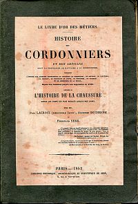 Lacroix, Paul/Duchesne, Alphonse/Seré, Ferdinand: Histoire des chardonniers et des Artisans dont la Profession se rattache à la Chordonnerie … L’Histoire de la Chaussure depuis les temps les plus reculés jusqu’a nos jours. Paris: Seré 1852. 4°. (3), 326, (1) S., 8 Farbtafeln, 17 sw-Tafeln, zahlreiche Illustrationen im Text, Tafelteil: 48 sw-Tafeln, broschiert (neuer Einband, dieser mit Gebrauchsspuren; Stempel auf Vorsatz; stockfleckig und teilweise wasserfleckig ohne Textverlust; Tafeln mehrheitlich sauber; teilweise unbeschnitten) (=Le Livre d’Or des Métiers) Enthält u.a.: Armorial des Anciennes Corporations des Cordonniers, Bottiers, Savetiers, Tanneurs et Corroyeurs de la France.