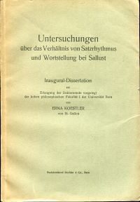 Koestler, Erna: Untersuchungen über das Verhältnis von Satzrhythmus und Wortstellung bei Sallust. Bern: Büchler 1931. Gr.-8°. 83 S., 3 Tabellen, broschiert (angebräunt; Einband mit leichten Gebrauchsspuren; sonst gut erhalten) (=Dissertation Bern 1931)