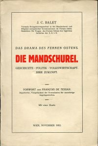 Balet, Jean Cyprien: Die Mandschurei. Das Drama des fernen Ostens ; Geschichte, Politik, Volkswirtschaft ; Ihre Zukunft. Wien: Osterr. Journal; Wien : Manz 1932. Gr.-8°. 208 S., 1 Karte, broschiert (unteres Kapital leicht eingerissen; Papier leicht gebräunt; sonst altersgemäss gut erhalten) Text in Fraktur.