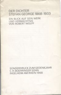 Wolff, Robert: Der Dichter Stefan George 1868-1933. Ein Blick auf sein Werk und Vermächtnis. Ingelheim: Boehringer 1968. Gr.-8°. 20 S., 5 sw-Abbildungen, geheftet (lichtrandig; wenig bestossen; sonst gut erhalten) (=Sonderdruck aus: Boehringer Zeitung, Dezember 1968)