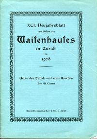 Cloetta, M.: Ueber den Tabak und vom Rauchen. Zürich: Beer 1928. Lex.-8°. 29 S., 1 Bildtafel, Geheftet (Einband mit Gebrauchsspuren; angebräunt; gut erhalten) (=Neujahrsblatt zum Besten des Waisenhauses in Zürich, Nr. 91/1928)