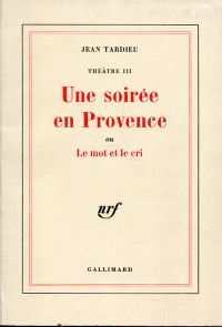 Tardieu, Jean: Une soirée en Provence ou Le mot et le cri. Pièces radiophoniques et livrets d’opéras de chambre. Paris: Gallimard 1983. 274 S., broschiert (Fehlstelle und Vermerk in Vorsatzblatt; sonst gut erhalten) (=Théâtre; 3)