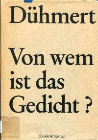 Dühmert, Anneliese: Von wem ist das Gedicht? Eine bibliographische Zusammenstellung aus 50 deutschsprachigen Anthologien. Berlin: Haude u. Spener 1969. 8°. VIII, 564 S., gebunden Bibliotheksexemplar; Stempel auf Vortitel; Schutzumschlag angebräunt und mit kleinen Einrissen und kleiner Fehlstelle ohne Textverlust; sonst gut erhalten)