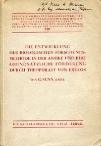 Senn, G.: Die Entwicklung der biologischen Forschungsmethode in der Antike und ihre grundsätzliche Förderung durch Theophrast von Eresos. Aarau: Sauerländer 1933. Gr.-8°. 262 S., Porträt auf Frontispiz, broschiert (private Widmung des Verfassers auf Umschlag; Einband angestaubt und abgegriffen; Papier altersbedingt leicht gebräunt; sonst altersgemäss gut erhalten) (=Veröffentlichungen der Schweizerischen Gesellschaft für Geschichte der Medizin und der Naturwissenschaften, Bd. 8).