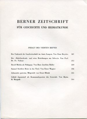 Beyeler, Hans: Der Umbruch der Landwirtschaft im Amte Laupen. Bern: Haupt 1945. Gr.-8°. S. 187 – 248, broschiert (leicht bestossen; sonst gut erhalten) (=Berner Zeitschrift für Geschichte und Heimatkunde; 1945/4)
