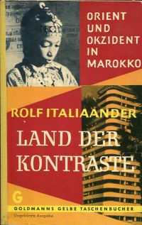 Italiaander, Rolf: Land der Kontraste. Orient u. Okzident in Marokko. Ungekürzte, überarb. Neuausg. München: Goldmann 1959. Kl.-8°. 162 S. kartoniert mit Leinenrücken (Papier gebräunt; gut erhalten) (=Goldmanns gelbe Taschenbücher ; Bd. 545)