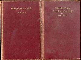 Huch, Ricarda: Die Romantik. 6.-9. Aufl. 2 Bände. Leipzig: Haessel 1920. 8°. VI, 1, 391; 3 Bll., 369 S., Pappband mit goldgeprägter Schrift und wenig Schmuck (Aussenscharnier von Band 1 teilweise angeplatzt; Bleistiftanstreichungen) Band 1: Blütezeit der Romantik – Band 2: Ausbreitung und Verfall der Romantik. Text in Fraktur.