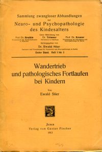 Stier, Ewald: Wandertrieb und pathologisches Fortlaufen bei Kindern. Jena: G. Fischer 1913. Gr.-8°. VII, 135 S. broschiert (Seiten nicht aufgeschnitten; angestaubt; eine Ecke leicht bestossen; sonst altersgemäss gut erhalten) (=Sammlung zwangloser Abhandlungen zur Neuro- und Psychopathologie des Kindesalters, Erster Bd., Heft 1 bis 3).