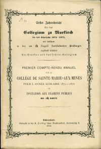 Collegium (Markirch): Jahresbericht über das Collegium zu Markirch für das Schuljahr …, mit welchem zu den am … stattfindenden Prüfungen ergebenst einladet … Compte rendu annuel sur le Collège de Sainte-Marie-aux-Mines pour l’année scolaire … et invitation aux examens publics … 2 Hefte. Schlettstadt [Séléstat]: Helbig 1871/72 Gr.-8°. 39; 27 S., broschiert (teilweise leicht stockfleckig; altersgemäss gut erhalten) Teilweise Text in Fraktur.