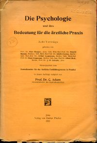 Adam, Curt: Die Psychologie und ihre Bedeutung für die ärztliche Praxis. Acht Vorträge gehalten von H. Berger, O. Bumke, A. Czerny, A. Leppmann, H. Liepmann, A. Moll, J. H. Schultz. Hrsg. v. Zentralkommitee für das ärztliche fortbildungswesen in Preussen. Jena: G. Fischer 1921. Gr.-8° IV, 150 S. broschiert (Besitzervermerk auf Einband und Titelseite geprägt; Einband mit kleinen Einrissen und kleiner Fehlstelle ohne Textverlust; gebräunt)