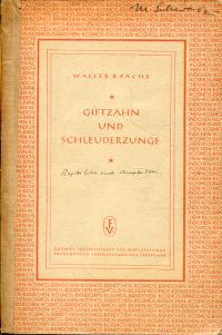 Sachs, Walter Bernhard: Giftzahn und Schleuderzunge. Seltsamkeiten aus dem Leben der wechselwarmen Geschöpfe. Stuttgart: Franckh 1948. 8°. 80 S., zahlreiche Illustrationen, broschiert (Besitzervermerk auf Umschlag und Vorsatz; Papierbedingt gebräunt) (=Kosmos-Bändchen)