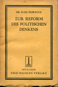 Hurwicz, Elias: Zur Reform des politischen Denkens. München: Drei Masken Verlag 1921. 8°. 103 S., broschiert (Umschlag angestaubt; Papier altersbedingt leicht gebräunt; Seiten teilweise nicht beschnitten; sonst altersgemäss gut erhalten) (=Bücherei für Politik und Geschichte des drei Masken Verlages)