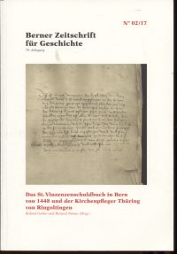 Gerber, Roland: Das St. Vinzenenschuldbuch in Bern von 1448 und der Kirchenpfleger Thüring von Ringoltingen. Bern: Historischer Verein 2017. 8°. 102 S., sw-Abbildungen, broschiert (gut erhalten) (=Berner Zeitschrift für Geschichte; 2/2017)
