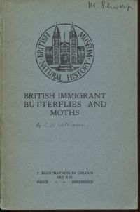 Williams, Carrington Bonsor: British immigrant Butterflies and moths. London: British Museum (Natural History) 1935. 9 gez. Bl., 5 Farbtafeln, broschiert (Besitzervermerk auf Umschlag und Titelblatt; Marginalien und montierter Zeitungsausschnitt auf Farbtafeln verso)