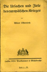 Osterrieth, Albert: Die Ursachen und Ziele des europäischen Krieges. Berlin: Puttkammer & Mühlbrecht 1914. 8°. 55 S., broschiert (Umschlag angestaubt; teilweise stockfleckig; sonst altersgemäss gut erhalten) Text in Fraktur.