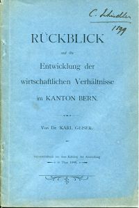 Geiser, Karl: Rückblick auf die Entwicklung der wirtschaftlichen Verhältnisse im Kanton Bern. Thun: Verlag des Central-Komitee der Gewerbeausstellung 1899. 39 S., broschiert (Besitzervermerk auf Umschlag; Papier altersbedingt leicht gebräunt; altersgemäss gut erhalten)