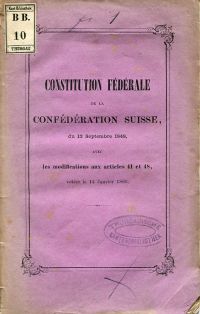 Constitution fédérale de la Confédération suisse, du 12 septembre 1848, avec les modifications aux articles 41 et 48, votées le 14 janvier 1866. 1866?. 8°. 40 S., broschiert (Bibliotheksexemplar; Bibliotheksvermerke; Umschlag abgegriffen und teilweise abgeblasst; Ecken bestossen)