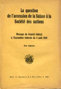 Message du Conseil fédéral à l’Assemblée fédérale concernant la question de l’accession de la Suisse à la Société des nations. (Du 4 août 1919) Avec annexes. Berne: Wyss 1919. 8’. 404 S., broschiert (Umschlag leicht angestaubt; Papier altersbedingt leicht gebräunt; sonst altersgemäss gut erhalten)