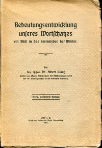 Waag, Albert: Bedeutungsentwicklung unseres Wortschatzes. Ein Blick in das Seelenleben der Wörter. 4., vermehrte Aufl. Lahr i.B.: Moritz Schauenburg 1921. Gr.-8°. XVI, 208 S. broschiert (Rücken, Kanten und Ecken etwas bestossen, die letzten 5 Blätter und hinteres Deckblatt mit kleinem Einriss).