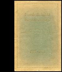 Steiner, Paul: Hundert Jahre Missionsarbeit. Zur Erinnerung an das hundertjährige Bestehen der Basler Mission 1815-1915. Basel: Verl. der Basler Missionsbuchhandlung 1915. Lex.-8°. 120 S., zahlreiche sw-Abbildungen, broschiert Einband beschabt und teilweise abgeblasst; teilweise leicht stockfleckig; leicht bestossen; sonst altersgemäss gut erhalten)