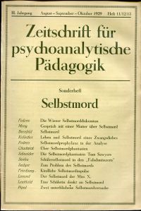Selbstmord. Sonderheft der Zeitschrift für psychoanalytische Pädagogik. Wien: Verlag der Zeitschrif für psychoanalytische Pädagogik 1929. 8°. S. 333-442, broschiert (leicht wasserwellig ohne Textverlust; sonst altersgemäss gut erhalten) (= Zeitschrift für psychoanalytische Pädagogik; III. Jahrgang, August-September-Oktober 1929; H. 11/12/13) Mit Beiträgen von Federn. Die Wiener Selbstmorddiskussion; Meng. Gespräch mit einer Mutter über Selbstmord; Bernfeld. Selbstmord. Kalischer. Leben und Selbstmord eines Zwangsdiebes. Federn. Selbstmordprophylaxe in der Analyse. Chadwick. Über Selbstmordphantasien. Schneider. Die Selbstmordphantasien Tom Sawyers. Sadger. Zum Problem des Selbstmords. Friedjung. Kindliche Selbstmordimpulse. Lorand. Der Selbstmord der Miss X. Leuthold. Eine Schülerin denkt an Selbstmord. Pipal. Zwei unterbliebene Selbstmordversuche.