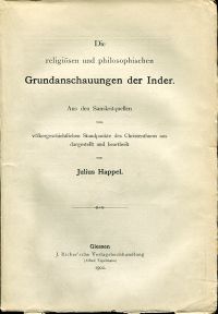 Happel, Julius: Die religiösen und philosophischen Grundanschauungen der Inder. Aus den Sanskritquellen vom völkergeschichtlichen Standpunkte des Christenthums aus dargestellt und beurtheilt. Giessen: J. Ricker 1902. Gr.-8°. VIII, 252 S. broschiert (Einband und Rücken bestossen; Seiten nicht beschnitten; Papier leicht gebräunt; Umschlag angestaubt; sonst altersgemäss gut erhalten)