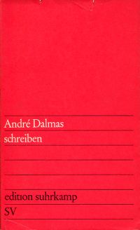Dalmas, André: schreiben. 1. – 8. Tsd. Frankfurt/Main: Suhrkamp 1965. Kl.-8°. 63 S., engl. broschiert (Schutzumschlag mit leichten Randläsuren; Papierbedingt leicht gebräunt; gut erhalten) (=edition suhrkamp, 104)