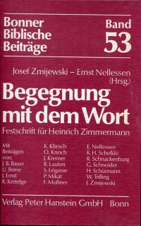 Zmijewski, J./Nellessen, E. (Hrsg.): Begegnung mit dem Wort. Festschrift für Heinrich Zimmermann. Bonn: Hanstein 1979. Gr.-8°. 1 Portr., 424 S., Bibliographie, Register, Pappband (leicht lichtrandig; gut erhalten) (=Bonner Biblische Beiträge, Bd. 53).