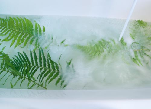 bildreich karten PK 1069: kräutermildbad. Querformat. (Badewanne, Wasser, Zusatz, Farn, Milch, Milchbad, Wellness) Mindestbestellmenge: 15 Karten (auch assortiert).