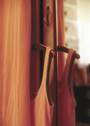 bildreich karten PK 107: camilla I. Hochformat. 2000. (Kleid, Schrank, Bügel, Kleiderbügel, Herzhell, Spiegelung, Frau, Schlafzimmer, Garderobe) Mindestbestellmenge: 15 Karten (auch assortiert).