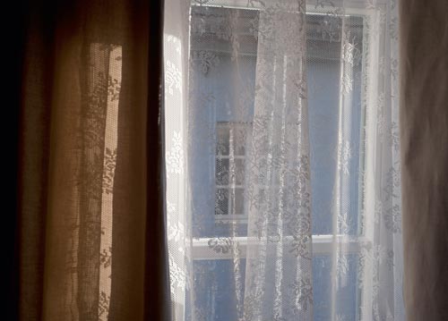 bildreich karten PK 1076: morgenlicht. Querformat. (Fenster, Vorhang, Sonne, Schatten, Gasse, Schlafzimmer, Ausblick, Licht) Mindestbestellmenge: 15 Karten (auch assortiert).