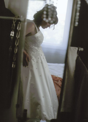 bildreich karten PK 108: penelope. Hochformat. 2000. (Braut, Spiegel, Kette, Kleid, Frau, Penelope) Mindestbestellmenge: 15 Karten (auch assortiert).