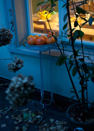 bildreich karten PK 1094: frische orangen. Hochformat. (Dämmerung, Abend, Orangen, Licht, Wohnzimmer, Esstisch, Wohnung, Haus, Fenster, Tee, Aussen, Innen) Mindestbestellmenge: 15 Karten (auch assortiert).