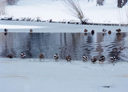 bildreich karten PK 1097: beisammen. Querformat. (Ente, Stockente, See, Eis, Ufer, Kälte, Spiegelung, Park) Mindestbestellmenge: 15 Karten (auch assortiert).