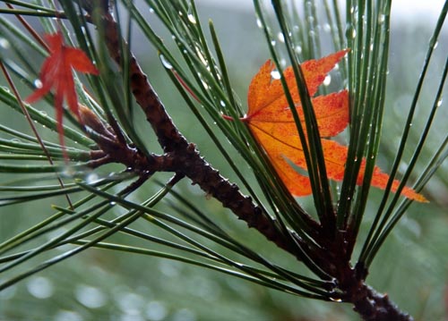 bildreich karten PK 1101: zwischenstation. Querformat. (Ahorn, Blatt, Pinie, Regen, Tropfen, Regentropfen) Mindestbestellmenge: 15 Karten (auch assortiert).