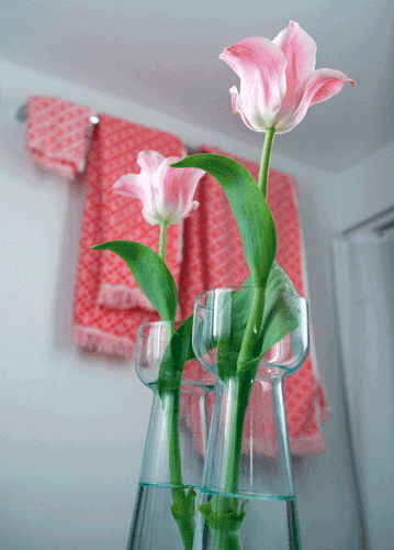 bildreich karten PK 1114: fruehlingsbad. Hochformat. (Tulbe, Spiegel, Spiegelung, Bad, Badzimmer, Badezimmer, Frottierwäsche, Badewäsche, Frottéwäsche, Handtuch, Hantücher, Musse, Vase, Badetuch, Ostern) Mindestbestellmenge: 15 Karten (auch assortiert).