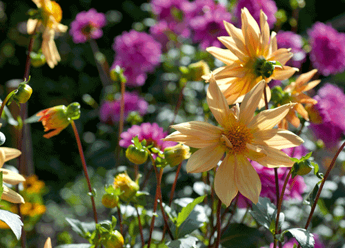 bildreich karten PK 1149: im dahlengarten. Querformat. (Garten, Bauerngarten, Dahlie) Mindestbestellmenge: 15 Karten (auch assortiert).