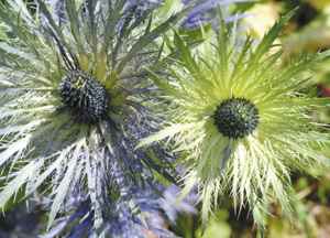 bildreich karten PK 179: distelpaar. Querformat. 2005. (Distel, Blaudistel, Alp, Paar) Mindestbestellmenge: 15 Karten (auch assortiert).