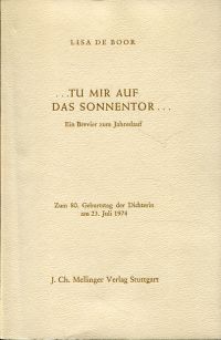 Boor, Lisa de: Tu mir auf das Sonnentor. Ein Brevier zum Jahreslauf. Zum 80. Geburtstag der Dichterin am 23. Juli 1974. Stuttgart: J.Ch. Mellinger 1973. 8°. 111 S. broschiert (Besitzervermerk auf Vorsatz; Ex Libris auf Innendeckel; Einband leicht angestaubt; gut erhalten)