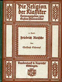 Schrempf, Christoph: Friedrich Nietzsche. Göttingen: Vandenhoeck & Ruprecht 1922. 128 S., Halbleinen (Besitzervermerk auf Vorsatz; Ex Libris auf Innendeckel; Einband mit leichten Gebrauchsspuren; Papier altersbedingt gebräunt; sonst altersgemäss gut erhalten) (=Die Religion der Klassiker, 9)