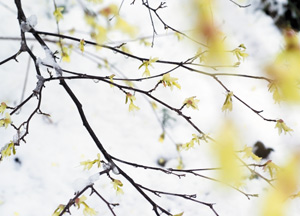 bildreich karten PK 272: zartes gelb I. Querformat. 2007. (Schnee, Blüte, Blütenzweige, Äste)