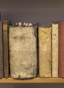 bildreich karten PK 293: wiedergefunden. Querformat. 2007. (Alte Bücher, Pergament, Post-it, Bücherregal, Tablar)