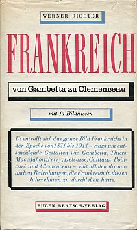 Richter, Werner: Frankreich. Von Gambetta zu Clemenceau. Erlenbach-Zürich: Rentsch 1946. 8°. 496 S., 14 Bildnisse, Leinen mit Kopffarbschnitt Schutzumschlag mit Randläsuren und angestaubt; sonst gut erhalten)